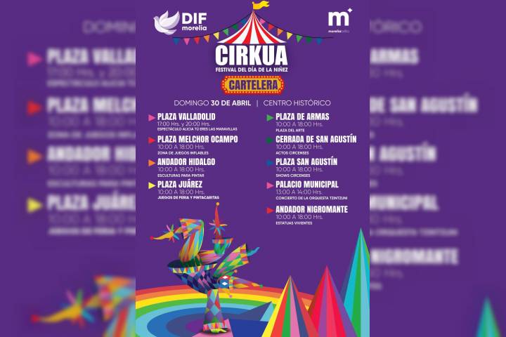 NOTICIAS 26/04/2023DIF Morelia presenta espectacular programa del Festival del Día de la Niñez "Cirkua"El DIF Morelia, que encabeza Paola Delgadillo Hernández, en colaboración con las distintas dependencias del Gobierno Municipal, invita a todas las familias a unirse a la celebración del Día de la Niñez en el festival "Cirkua", que se llevará a cabo el próximo domingo 30 de abril en el Centro Histórico de Morelia.