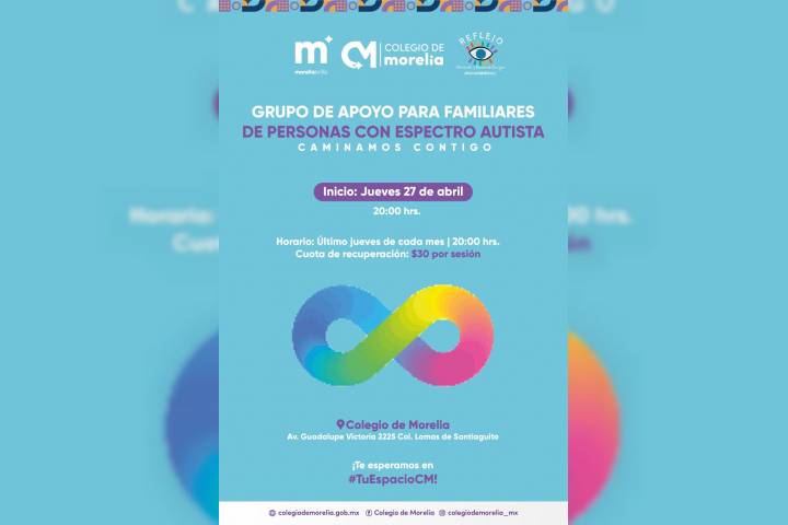 NOTICIAS 17/04/2023Gobierno de Morelia integra grupo de apoyo a familiares de personas autistasEl Colegio de Morelia invita a las sesiones del grupo de apoyo "Acompañamiento y Contención a familiares de personas en el aspecto autista", en coordinación con la organización Reflejo, y la psicóloga familiar, Génesis Gómez Infante.