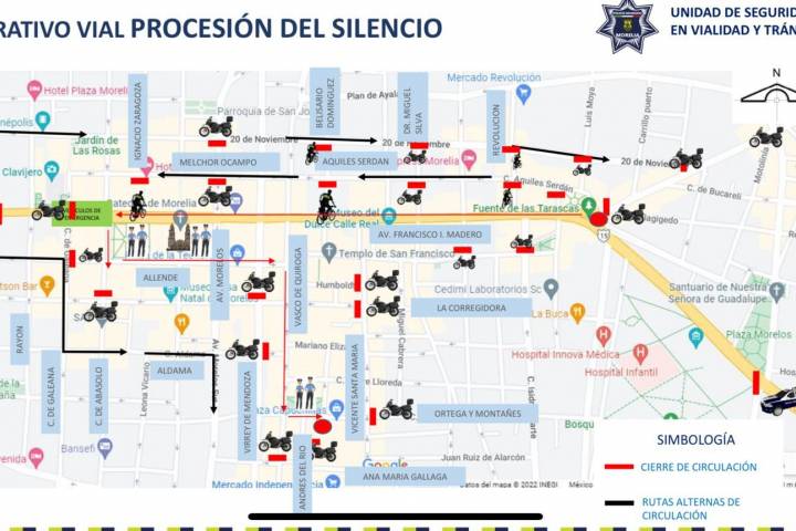 Este Viernes Santo, por motivo de la Procesión del Silencio, a partir de las 18:00 horas, la Policía Morelia implementará cortes a la circulación vial en el Centro Histórico y en calles aledañas al ex Convento de Capuchinas. Por instrucciones del Presidente Municipal Alfonso Martínez Alcázar, el operativo de prevención y vigilancia se efectuará a fin de garantizar la tranquilidad entre las y los morelianos, así como de turistas y v...