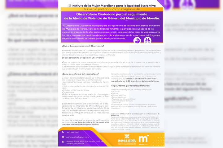 Con la finalidad de fomentar la participación ciudadana en las políticas públicas para la atención y prevención de la violencia de género, el Gobierno Municipal, a traves de lnstituto de la Mujer Moreliana para la Igualdad Sustantiva (IMMUJERIS), lanzó la convocatoria para integrar el Observatorio Ciudadano que dará seguimiento a la Alerta de Violencia de Género en Morelia. Entre las actividades principales del Observatorio Ciudadano ...