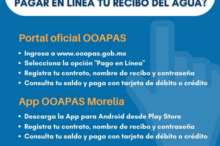 NOTICIAS 08/11/2022OOAPAS reactiva sus opciones de pago en líneaLas opciones de pago en línea del Organismo Operador de Agua Potable, Alcantarillado y Saneamiento de Morelia (OOAPAS) están nuevamente activas, por lo que a partir de hoy los usuarios ya pueden pagar su recibo del agua a través de la página oficial www.ooapas.gob.mx, y en la App OOAPAS Morelia para sistemas Android.