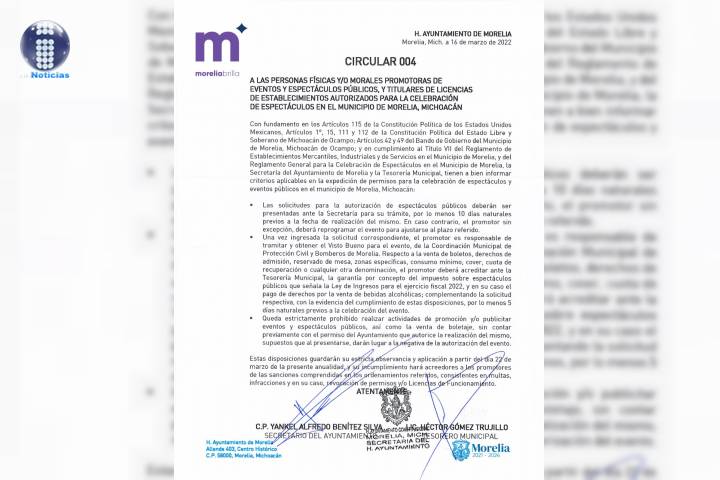 Morelia, Michoacán; 16 de marzo de 2022.- En aras de promover un desarrollo económico encaminado al orden y resguardo de la salud de las y los morelianos, el Gobierno Municipal estableció criterios aplicables para la aprobación de eventos y espectáculos públicos que deberán ser observados, conocidos y seguidos tanto por promotores y titulares de licencias de establecimientos comerciales para la realización de los mismos, desde el próxi... Ver más...