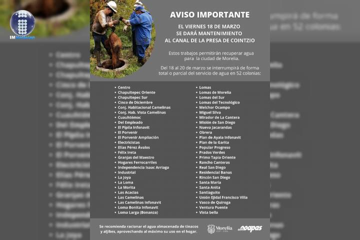 NOTICIAS 14/03/2022Anuncia OOAPAS mantenimiento al canal de la presa de CointzioEste viernes 18 de marzo, personal del Organismo Operador de Agua Potable, Alcantarillado y Saneamiento de Morelia (OOAPAS) dará mantenimiento al canal que conduce agua desde la presa de Cointzio hasta la Planta Potabilizadora Vista Bella, una de las instalaciones más importantes de abastecimiento para la ciudad de Morelia. La actividad consistirá en el retiro de raÃces y material azolvado al interior del canal, lo cual ha reducido la capacid... Ver más...