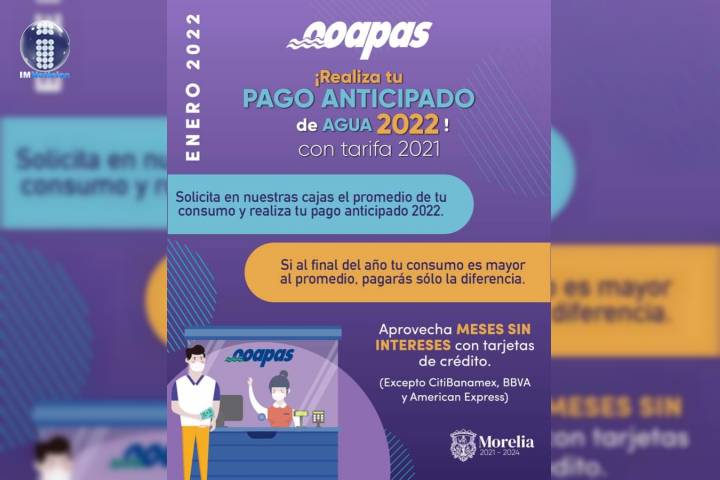 NOTICIAS 28/01/2022Continúa beneficio de pago anticipado en servicio de agua: OOAPASA tres días de concluir el primer mes del año, el Organismo Operador de Agua Potable, Alcantarillado y Saneamiento de Morelia (OOAPAS) informa que continúa su Programa de Pago Anticipado hasta concluir enero, para que los morelianos paguen el agua del 2022 con la tarifa del 2021.