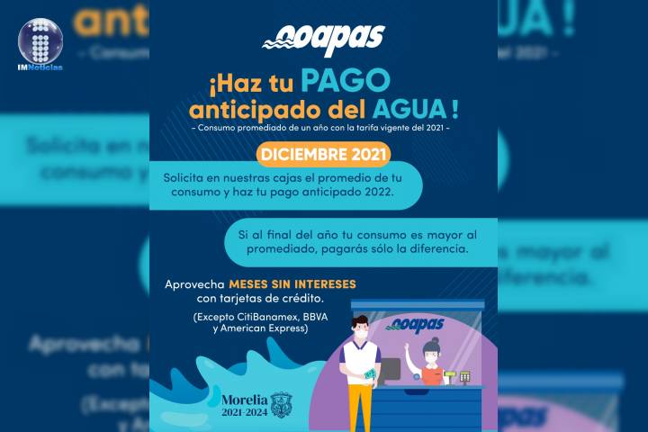 NOTICIAS 12/12/2021Este lunes inicia el Pago Anticipado en el OOAPAS A partir de este lunes 13 y durante todo el mes de diciembre el Organismo Operador de Agua Potable, Alcantarillado y Saneamiento de Morelia (OOAPAS) iniciará su programa de Pago Anticipado, donde los usuarios podrán pagar su consumo promediado del año 2022 con la tarifa vigente del 2021.
