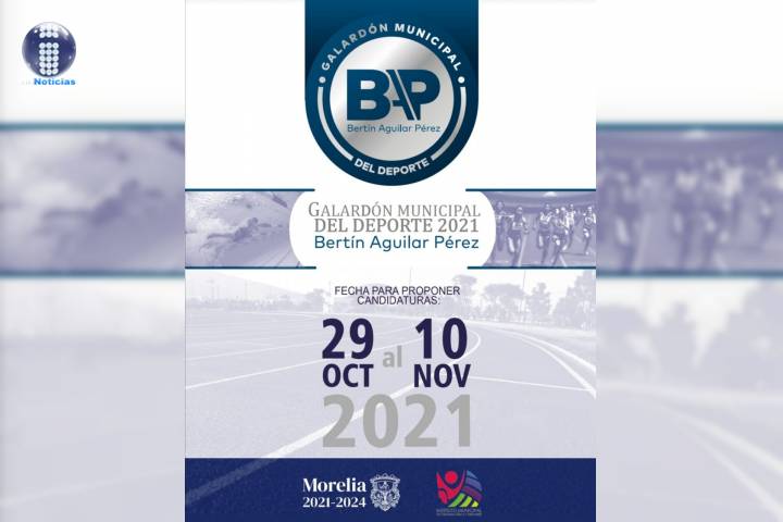 Morelia, Michoacán, 08 de noviembre del 2021.- Este próximo 10 de noviembre vence el plazo para registrar candidatos a la 6ª edición del Galardón Municipal del Deporte, "Bertín Aguilar Pérez" 2021 que ha cobrado notoriedad en el ámbito deportivo capitalino desde el año 2013 cuando el ayuntamiento de Morelia a través del Instituto Municipal de Cultura Física y Deporte (IMCUFIDE), la entregó por primera vez.