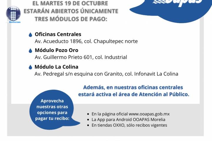 NOTICIAS 18/10/2021El OOAPAS trabajará con guardias el 19 de octubreEl Organismo Operador de Agua Potable, Alcantarillado y Saneamiento de Morelia (OOAPAS) informa que el próximo martes 19 de octubre se trabajará en la paramunicipal con personal de guardia en tres (03) módulos de pago durante este día, para que los usuarios puedan acercarse a pagar su recibo del agua. Los módulos que estarán activos este martes de las 08:00 a las 14:30 horas, son los siguientes: