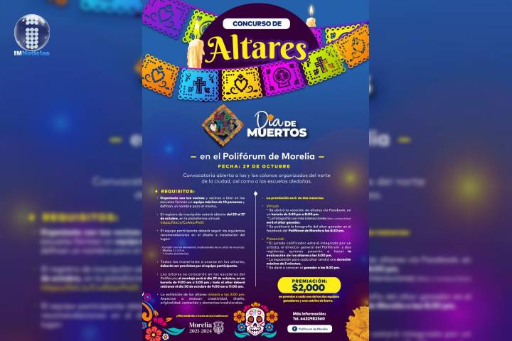 NOTICIAS 21/10/2021Presenta Polifórum de Morelia gran programa cultural y gastronómico para Día de Muertos El próximo 29 de octubre, el Polifórum de Morelia se vestirá de color y tradición con diferentes actividades con las que se ofrecerá una variada oferta cultural y gastronómica, alusiva a la celebración del Día de Muertos.