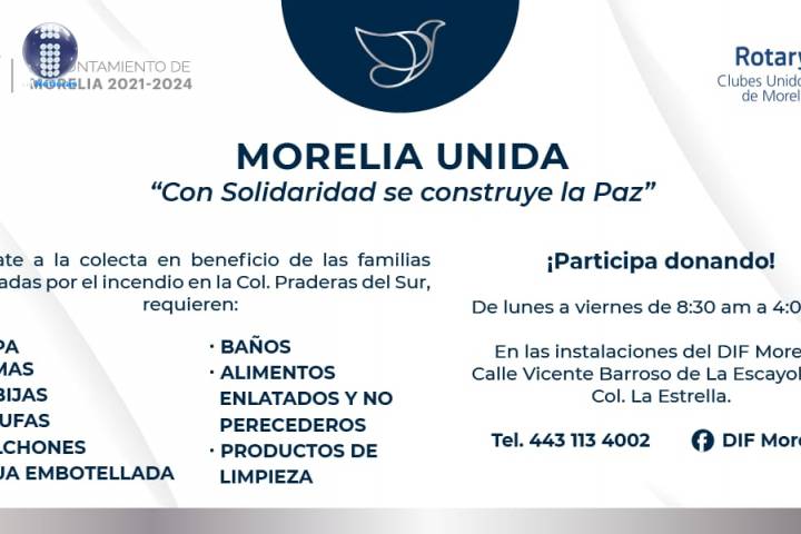 NOTICIAS 25/09/2021Invita DIF Morelia a colecta en apoyo a damnificados por incendio en Praderas del SurEl presidente municipal, Alfonso Martínez Alcázar, a través del SMDIF Morelia y en alianza con Clubes Rotarios Unidos de Morelia, invita a las y los morelianos a sumarse a la colecta #MoreliaUnida, en beneficio de las familias afectadas por el incendio en la colonia Praderas del Sur, para que puedan reconstruir su hogar.
