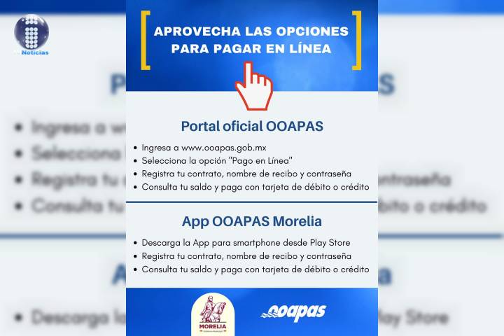 NOTICIAS 09/08/2021OOAPAS Morelia anuncia medidas preventivas en oficinas centrales El Organismo Operador de Agua Potable, Alcantarillado y Saneamiento de Morelia (OOAPAS) informa que a partir de mañana martes 10 de agosto las oficinas centrales dejarán de dar atención presencial en escritorios y únicamente se permitirá el acceso de personas para pagar recibos en las ventanillas. Asimismo, todos los trámites, aclaraciones y convenios de pago se harán vÃa telefónica.