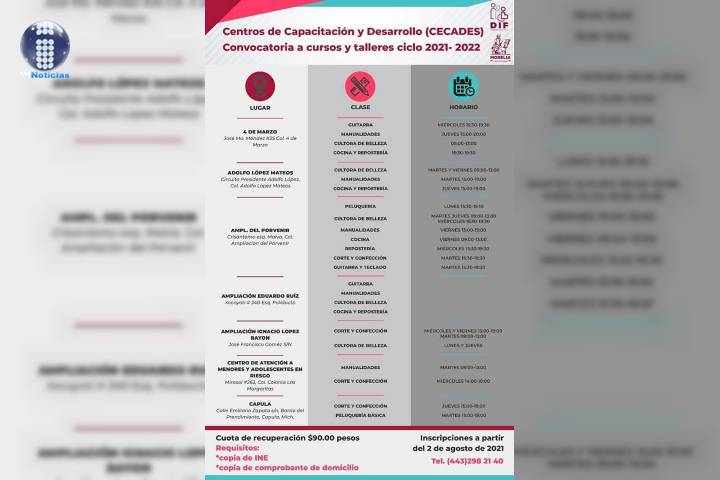 El Gobierno de Morelia, a través del Sistema DIF Municipal, convoca a jóvenes, mujeres y hombres a inscribirse a los cursos y talleres del ciclo 2021-2022 en los Centros de Capacitación y Desarrollo (Cecades) que se encuentran en las colonias y comunidades.