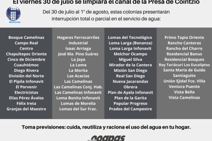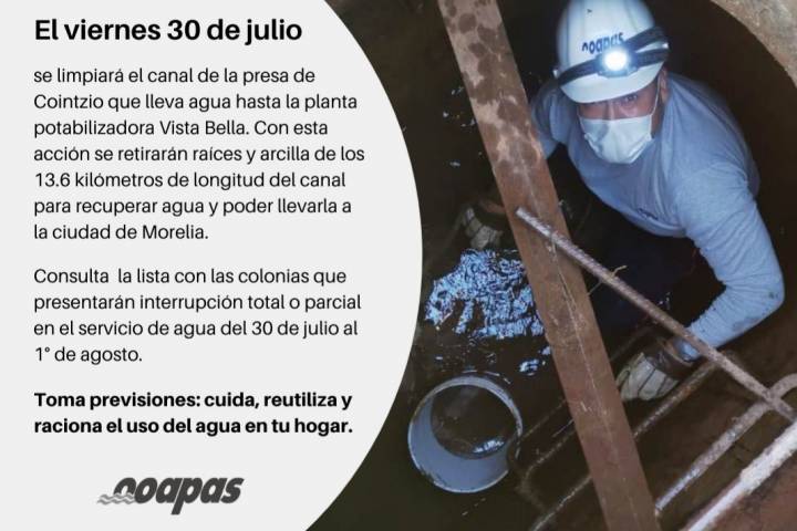 Este viernes 30 de julio personal del Organismo Operador de Agua Potable, Alcantarillado y Saneamiento de Morelia (OOAPAS) dará mantenimiento al canal de la presa de Cointzio, que es de donde se envía agua a la Planta Potabilizadora de Santa María para abastecer directamente a 53 colonias de la capital michoacana. Con esta actividad se recuperarán volúmenes de agua.
