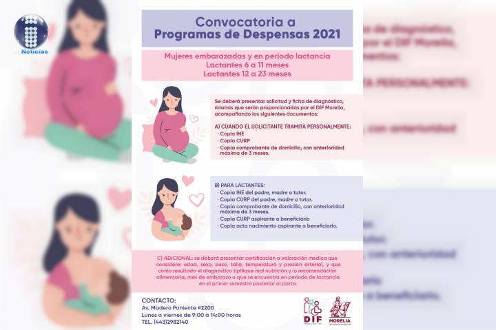 NOTICIAS 15/06/2021DIF Morelia abre convocatoria a Programa de Despensas 2021 El Ayuntamiento de Morelia a través del DIF Municipal, dio a conocer los requisitos para ser beneficiarios del padrón 2021 de los programas de despensas para mujeres embarazadas, personas con discapacidad y adultos mayores.