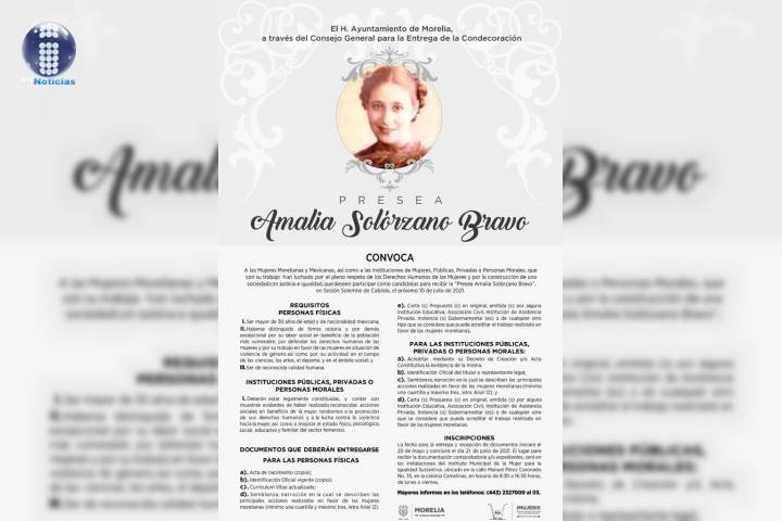 NOTICIAS 16/06/2021Continúa abierta la convocatoria para la Presea "Amalia Solórzano Bravo"La convocatoria para la Presea "Amalia Solórzano Bravo", continúa abierta para las mujeres o instituciones de mujeres aspirantes a recibir dicho galardón, que será entregado el día 10 de julio en Sesión Solemne de Cabildo, reconocimiento que entrega el Gobierno de Morelia.