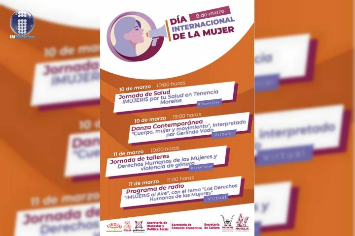 NOTICIAS 07/03/2021Este lunes, IMUJERIS arranca jornada "Por los Derechos de las Mujeres"En el marco del Día Internacional de la Mujer, que se conmemora este lunes 8 de marzo, el Gobierno de Morelia realizará diversas actividades, reconociendo el papel decisivo que las mujeres han tenido en los diversos ámbitos.