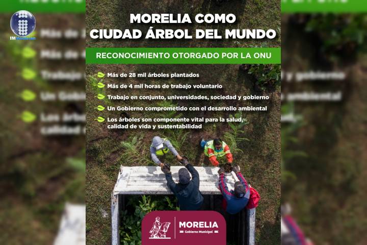 NOTICIAS 02/03/2021Reconoce ONU a Morelia como Ciudad Árbol del MundoDerivado del esfuerzo colectivo entre el Gobierno Municipal, el Centro de Investigaciones en Geografía Ambiental de la UNAM y la sociedad, Morelia, fue reconocida por la Organización de las Naciones Unidas, como ?Ciudad Árbol del Mundo', al lograr plantar más de 28 mil ejemplares y abonar así a la reforestación urbana y demostrar su compromiso con el desarrollo ambiental.