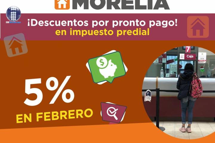 Por ello, la Tesorería Municipal de Morelia continua otorgando descuentos en el pronto pago del Impuesto Predial durante Febrero del 2021 se cuenta con el 5 por ciento de descuento finalizando el próximo 28 del presente mes.