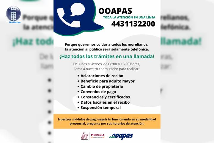 NOTICIAS 11/02/2021El OOAPAS anuncia nueva modalidad para realizar trámitesAnte la situación crítica que se vive en la capital michoacana debido al incremento de contagios por COVID-19, el Organismo Operador de Agua Potable, Alcantarillado y Saneamiento de Morelia (OOAPAS) reafirma su compromiso de seguir operando y brindando atención a la ciudadanía, dando prioridad a la salud de los morelianos, tanto de los usuarios como de los trabajadores. Es por esta razón que a partir del viernes 12 de febrero, todos los edif... Ver más...