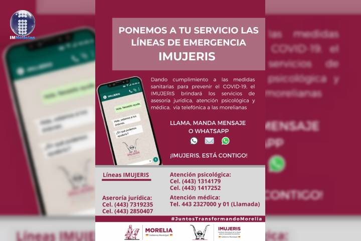 NOTICIAS 15/01/2021Activa Líneas de Emergencia IMUJERIS para brindar atención a las morelianasEl Instituto Municipal de la Mujer para la Igualdad Sustantiva (IMUJERIS), brindará asesoría jurídica, atención psicológica y médica a las morelianas, vía telefónica a través de las Líneas de Emergencia, lo anterior con el fin de cumplir con las medidas sanitarias establecidas para prevenir el COVID-19.