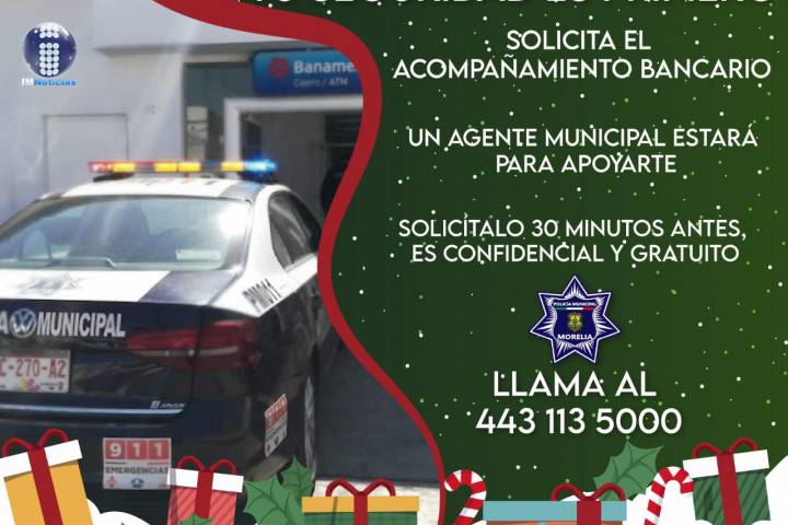 NOTICIAS 16/12/2020Policía de Morelia refuerza vigilancia en zonas bancariasA fin de garantizar la seguridad de la población que realiza movimientos bancarios en la capital michoacana, la Policía de Morelia en coordinación con autoridades de los tres niveles reforzó la seguridad en las inmediaciones de las instituciones bancarias del municipio, en cumpliento a la instrucción del presidente municipal de Morelia, Raúl Morón Orozco, dotar de tranquilidad durante la temporada decembrina.