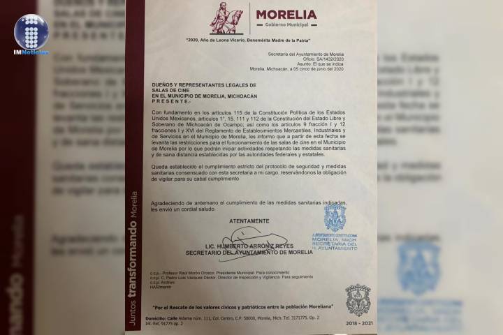 NOTICIAS 07/06/2020Avala Gobierno de Morelia reapertura de salas de cineComo parte del traslado a la nueva normalidad y con el fin de abonar a la reactivación económica, el Gobierno de Morelia, dio su autorización para la reapertura en el municipio de las salas de cine, con efecto inmediato, con la condición única de que las mismas deberán de acatar las medidas designadas por el Ayuntamiento, tanto de seguridad como sanitarias.