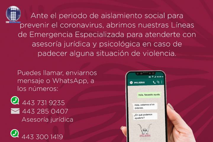 NOTICIAS 01/05/2020Mantiene IMUJERIS líneas de emergencias especializadas para morelianasCon el fin de brindar atención puntual a las mujeres que padecen algún tipo de violencia durante el periodo de aislamiento para prevenir el COVID-19, el Instituto Municipal de la Mujer para la Igualdad Sustantiva (IMUJERIS), mantiene los servicios de asesoría jurídica y atención psicológica, mediante las Líneas de Emergencia Especializadas.