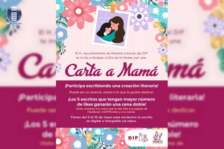 NOTICIAS 06/05/2020Invita DIF Morelia a participar en concurso del Día de la MadreEl Ayuntamiento de Morelia que encabeza el Presidente Municipal Raúl Morón Orozco, a través del DIF convoca a participar en el concurso del Día de la Madre "Carta a Mamá" con la finalidad de fomentar la escritura y la literatura durante la cuarentena por el COVID-19.