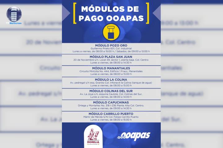 NOTICIAS 30/03/2020Oficinas Centrales de OOAPAS cambia su horario de atenciónAtendiendo a las recomendaciones de las autoridades sanitarias y con el fin de resguardar la salud tanto de los usuarios como de los trabajadores, el Organismo Operador de Agua Potable, Alcantarillado y Saneamiento de Morelia (OOAPAS) informa que a partir de este lunes 30 de marzo las oficinas centrales ubicadas en Av. Acueducto 1896, col. Chapultepec norte modificarán su horario de atención al público, el cual será de 08:00 a 17:00 horas, de... Ver más...
