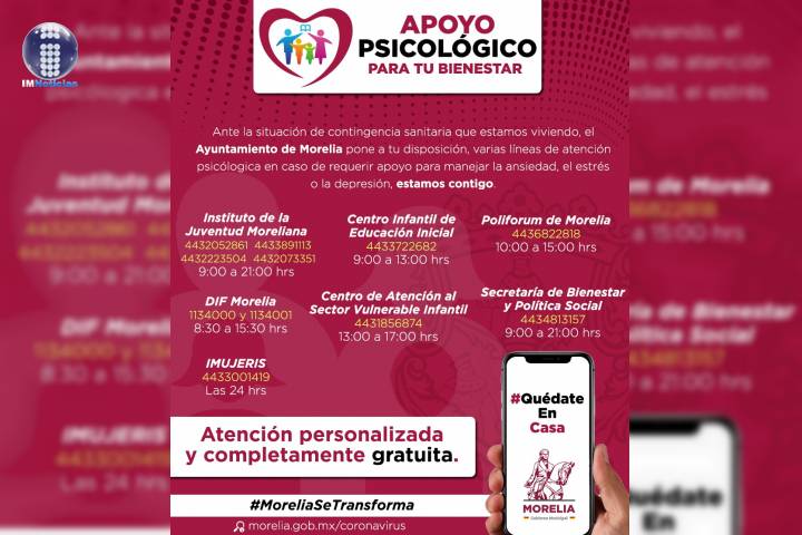 NOTICIAS 30/03/2020Apertura Gobierno de Morelia líneas de atención psicológica ante COVID-19Ante la situación de contingencia que enfrentamos debido al virus COVID-19, el Gobierno de Morelia, a través de sus diferentes dependencias, pone a disposición de la ciudadanía líneas de atención psicológica para quienes así lo requieran ante problemas como ansiedad, depresión, estrés o violencia de género durante la etapa de aislamiento.