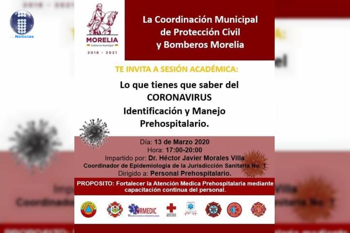 NOTICIAS 12/03/2020Gobierno de Morelia promueve la prevención de enfermedadesCon el objetivo de brindar a la población la información correcta, el Gobierno de Morelia a través de la Coordinación Municipal de Protección Civil y Bomberos de la ciudad realizará la sesión académica "Lo que tienes que saber del CORONAVIRUS. Identificación y manejo prehospitalario" el próximo 13 de marzo en el Poliforum Centro de Innovación Social de 17:00 a 20:00 horas.