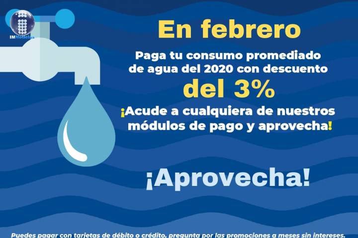 NOTICIAS 01/02/2020Pago Anticipado del agua seguirá en febrero con 3 por ciento de descuento El Organismo Operador de Agua Potable, Alcantarillado y Saneamiento de Morelia (OOAPAS) extenderá su programa de Pago Anticipado y durante el mes de febrero los morelianos podrán pagar todo el 2020 con 3 por ciento de descuento.