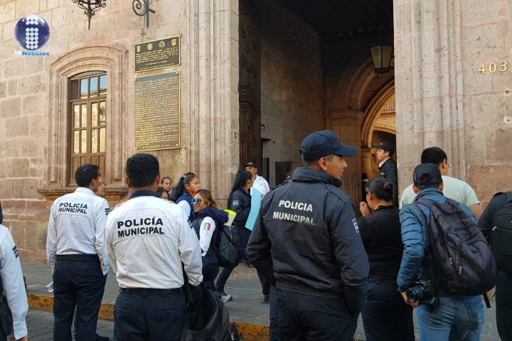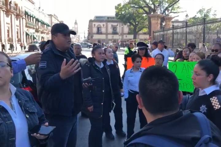 NOTICIAS 31/12/2019Policías de Morelia se manifiestan para exigirle a Morón resuelva pagos pendientesUn grupo de policías se manifiestan afuera de Catedral, para exigir la presencia del presidente municipal, Raúl Morón a fin de que resuelva los pagos pendientes de salario y demás prestaciones.