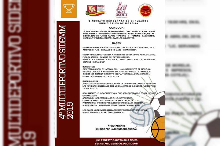 Con el fin de fomentar el deporte y la sana convivencia entre los trabajadores del municipio, el Ayuntamiento de Morelia en conjunto con el Sindicato Demócrata de Empleados Municipales de Morelia (SIDEMM) anunció la realización del 4to. Torneo Multideportivo denominado "Jesús Antonio Pérez Herrejón", a realizarse el próximo 25 de abril del presente en las instalaciones del Auditorio 'Servando Chávez Hernández'.
