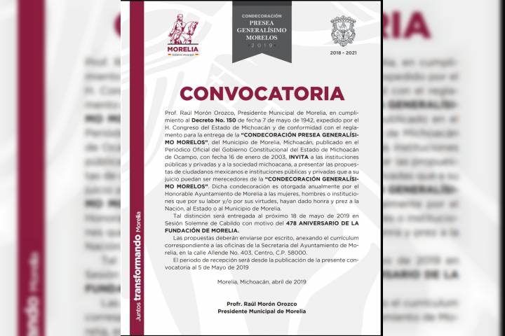 El Honorable Ayuntamiento de Morelia, a través del presidente municipal, Raúl Morón Orozco, emitió la convocatoria para la Condecoración Presea Generalísimo Morelos, en la cual invita a sector público, privado y sociedad en general, a nominar a las personas e instituciones que, de acuerdo a su criterio, merezcan ser reconocidos.