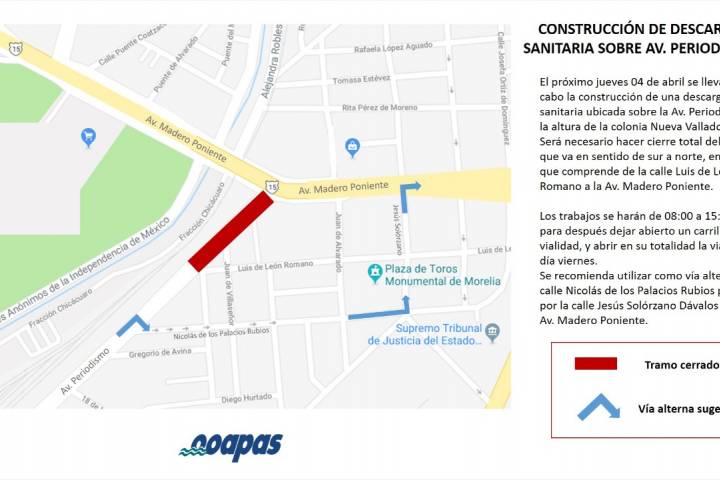 El Organismo Operador de Agua Potable Alcantarillado y Saneamiento de Morelia (OOAPAS) informa que el próximo jueves 04 de abril se llevará a cabo la construcción de una descarga sanitaria ubicada sobre la Avenida Periodismo, a la altura de la colonia Nueva Valladolid. Por esta razón será necesario hacer cierre total del carril que va en sentido de sur a norte, en el tramo que comprende de la calle Luis de León Romano a la Avenida Madero ... Ver más...