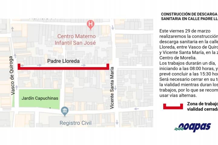 El Organismo Operador de Agua Potable Alcantarillado y Saneamiento de Morelia (OOAPAS) informa que el próximo viernes 29 de marzo se llevará a cabo la construcción de una descarga sanitaria ubicada sobre la calle Padre Lloreda, en la zona Centro de la ciudad. Por esta razón será necesario hacer cierre total de la circulación de esta calle, en el tramo que va de la calle Vasco de Quiroga a la Calle Vicente Santa María, de la zona Centro d... Ver más...