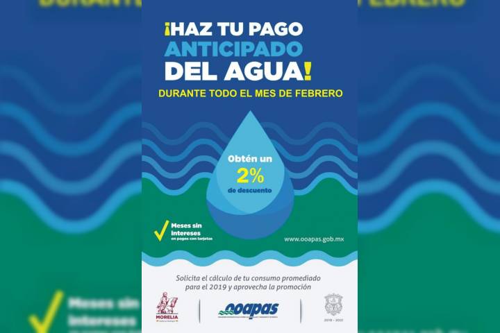 El Organismo Operador de Agua Potable, Alcantarillado y Saneamiento de Morelia (OOAPAS) mantendrá el Programa de Pago Anticipado todo el mes de febrero para que los usuarios puedan pagar su consumo promediado de 2019 con un descuento del dos por ciento (2%).