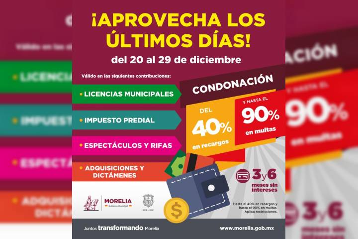 NOTICIAS 21/12/2018Mantiene Ayuntamiento oferta para apoyar regularización y economía de ciudadanos En aras de ofrecer a los ciudadanos ponerse al corriente en sus impuestos y apoyar al mismo tiempo la economía de las familias morelianas, el Ayuntamiento de Morelia, mantiene la promoción de 40 por ciento de descuento sobre recargos por concepto de predial y licencias y del 90 en multas, pago que podrá efectuarse a través de diversos módulos hasta el 29 de diciembre.
