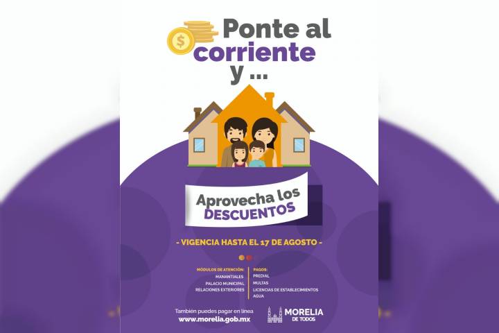 NOTICIAS 06/08/2018Tesorería ofrecerá descuentos en diversos pagos durante el presente mes En la ruta de continuar con una eficiencia administrativa y buena recaudación para dotar a la ciudadanía de más y mejores servicios públicos, el Ayuntamiento de Morelia mediante la Tesorería Municipal pone a disposición de los morelianos, descuentos en los pagos del predial, multas, licencias de establecimientos y agua hasta el próximo 17 de agosto.