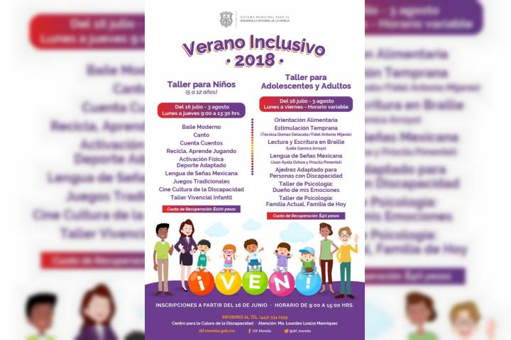 El Sistema DIF Municipal de Morelia invita a la sociedad en general a inscribirse y participar en los talleres "Verano Inclusivo 2018", los cuales se ofrecerán a niños, adolescentes y adultos para aprender actividades inclusivas en distintos ámbitos. Cabe detallar que este programa de verano brinda la posibilidad a participar en una serie de talleres inclusivos enfocados en distintas actividades como el deporte adaptado, lenguaje de señas...