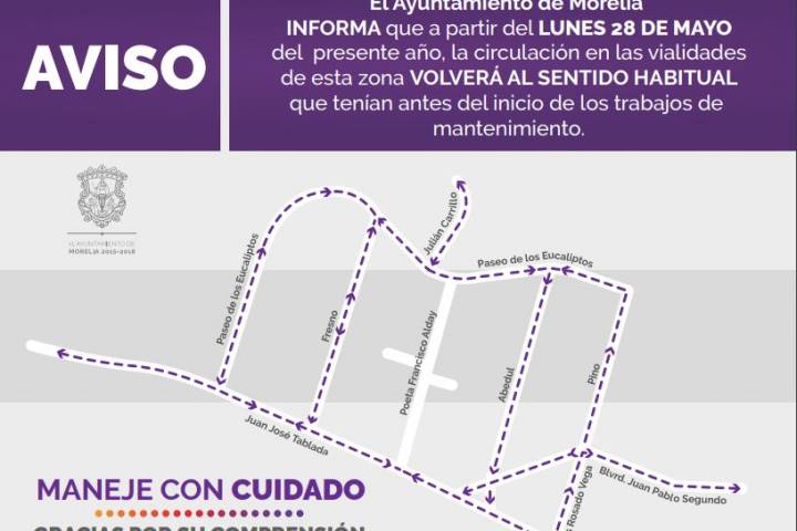 NOTICIAS 27/05/2018Este lunes, circulación regresa a su normalidad en J. J. TabladaEl Ayuntamiento de Morelia, a través de la Secretaría de Desarrollo Metropolitano e Infraestructura, informa a la ciudadanía que a partir de este lunes 28 de mayo la calle J. J. Tablada regresará a su circulación habitual de doble sentido.