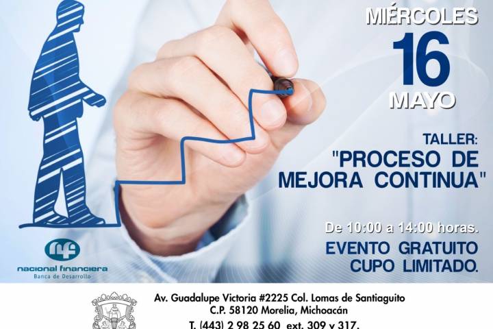 NOTICIAS 13/05/2018Colegio de Morelia invita al Taller "Proceso de Mejora Continua"El Colegio de Morelia anunció el taller "Proceso de Mejora Continua", el cual está enfocado en dar herramientas y capacitación empresarial, en tanto que se efectuará en sus instalaciones el próximo miércoles 16 de mayo del presente año en un horario de 10:00 a 14:00 horas, de forma gratuita y con cupo limitado.