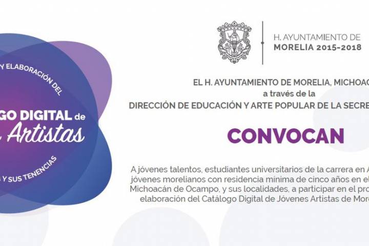 NOTICIAS 13/05/2018Sigue abierta, convocatoria a integración del Catálogo Digital de Jóvenes ArtistasEl Ayuntamiento de Morelia, a través de la Secretaría de Cultura Municipal, recuerda a la ciudadanía que continúa abierta la convocatoria de integración del "Catálogo Digital de Jóvenes Artistas", la cual va dirigida a personas de 17 a 24 años, con al menos cinco años de residencia en la Capital Michoacana.