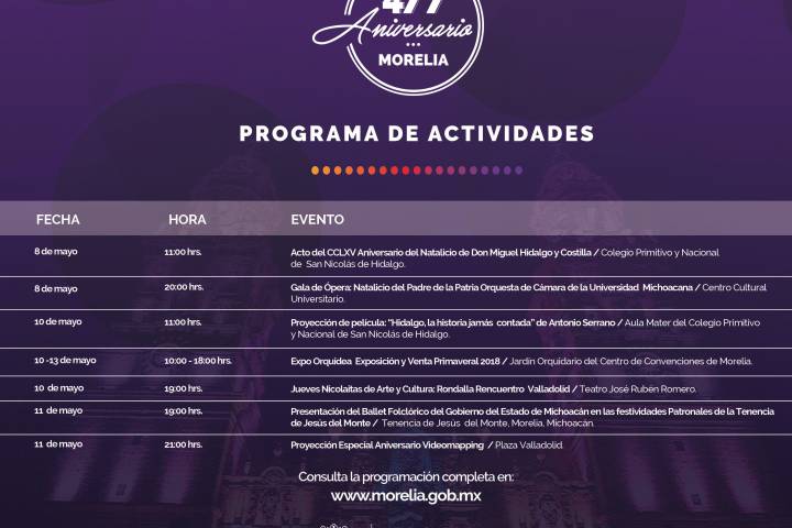 NOTICIAS 07/05/2018Esta semana, continúan actividades del 477 Aniversario de Morelia en Ciudad y Tenencias El Ayuntamiento de Morelia informa que durante esta semana continuarán las actividades cÃvicas artÃsticas y culturales que enmarcan el 477 Aniversario de la Fundación de la Ciudad, mismas que tienen lugar tanto en la zona urbana del municipio asà como en comunidades y tenencias.
