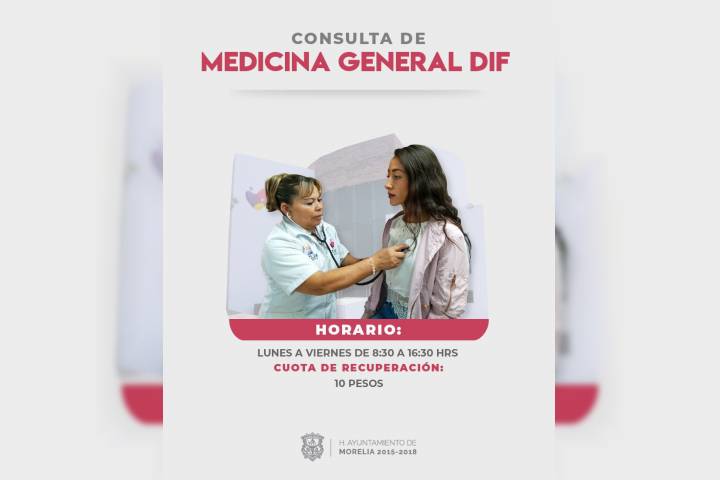 NOTICIAS 04/05/2018Sistema DIF Morelia ofrece consultas de medicina general a la población Como parte de los programas de atención a la salud de los habitantes del municipio, el Sistema DIF Morelia ofrece consultas de medicina general, atención dental y psicológica al público en general, en sus instalaciones en un horario de lunes a viernes de 8:30 a 16:00 horas.