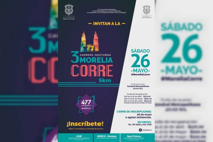 NOTICIAS 28/04/2018Ayuntamiento de Morelia invita a participar en la Tercera Carrera Nocturna "Morelia Corre"Como parte de las actividades realizadas por el 477 Aniversario de Morelia, el Ayuntamiento a través del Instituto de la Juventud Moreliana (IJUM) invitan a la sociedad en general a participar en la carrera nocturna "Morelia Corre", que se realizará el próximo 26 de mayo en el Centro Histórico de la Capital Michoacana.