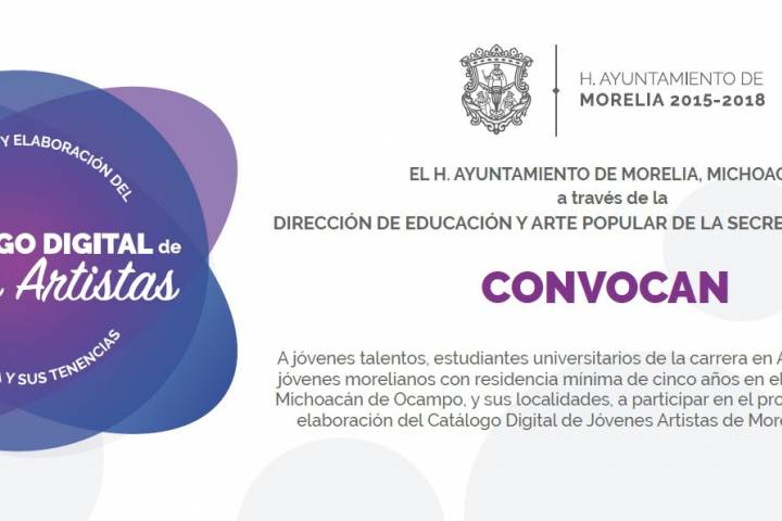 NOTICIAS 30/04/2018La Secretaría de Cultura convoca a la integración y elaboración del Catálogo Digital de Jóvenes Artistas La Secretaría de Cultura de Morelia invita a jóvenes talentos, estudiantes universitarios de la carrera en Artes Visuales o afines, morelianos con residencia mínima de cinco años en el Municipio y sus localidades, a participar en el proyecto de la integración y elaboración del "Catálogo Digital de Jóvenes Artistas".