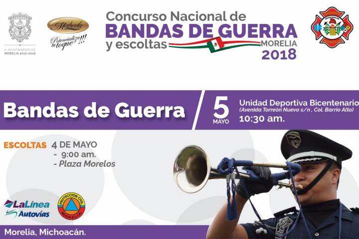 NOTICIAS 01/05/2018Ayuntamiento de Morelia invita al Concurso Nacional de Bandas de Guerra y Escoltas 2018El Ayuntamiento de Morelia, a través de la Coordinación Municipal de Protección Civil y Bomberos Municipal, invita a la ciudadanía en general a asistir al Concurso Nacional de Bandas de Guerra y Escoltas 2018, que se llevará a cabo este fin de semana en la Capital Michoacana.