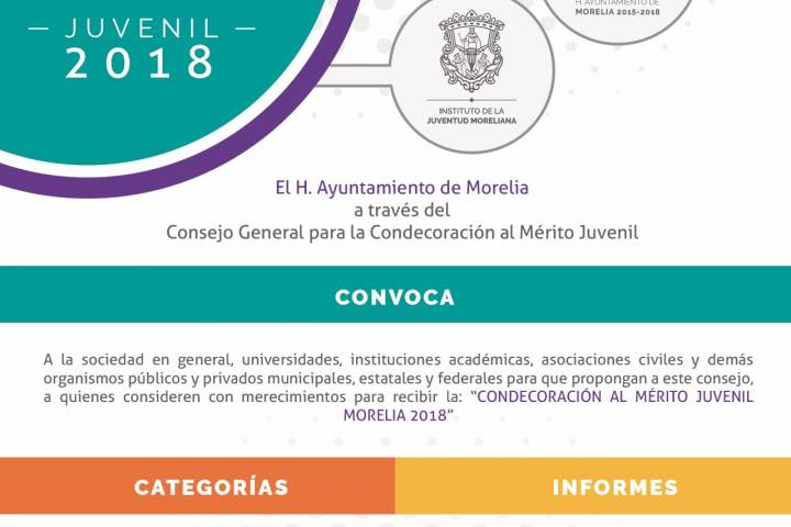 NOTICIAS 26/04/2018Último día de la Convocatoria a la "Condecoración al Mérito Juvenil 2018"El Ayuntamiento de Morelia recuerda a la ciudadanía en general que este jueves 26 de abril es la fecha límite para realizar las inscripciones a la "Condecoración al Mérito Juvenil 2018" que se realiza a través del Instituto de la Juventud Moreliana (IJUM), en ocho diferentes ámbitos: social, deportivo, académico, artístico cultural, discapacidad e inclusión, profesional, innovación tecnológica y medio ambiente.