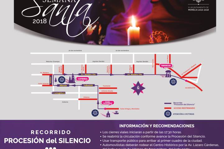 NOTICIAS 29/03/2018Este viernes a partir de las 17:30 horas, cierre de vialidades por Procesión del SilencioLa Policía de Morelia recuerda que con motivo de la Procesión del Silencio, a partir de las 17:30 horas de este viernes, se cerrarán la Avenida Francisco I. Madero, así como algunas calles aledañas del primer cuadro de la ciudad, por lo que se hace un llamado a la ciudadanía a tomar vías alternas de circulación y hacer uso del transporte público.
